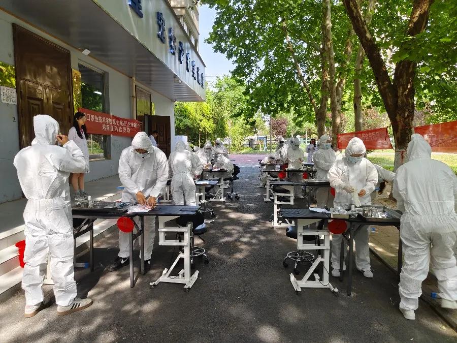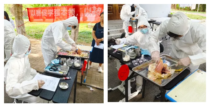 竞赛现场,参赛选手们个个精神饱满、信心十足。他们熟练地运用各种器械,从鸡的采血、致死,到肌肉、皮下组织检查,再到胸腹腔整体观察,最后正确、完整分离、剖解心肝脾肺等器官,每一个步骤都有条不紊地进行着。选手们专注的神情、精准的操作,展现出了扎实的专业功底和良好的职业素养。