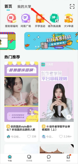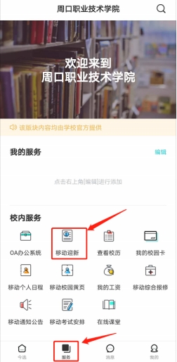 1、登录今日校园后,点击‘我的大学’页面,点击‘移动迎新’,进入迎新页面;