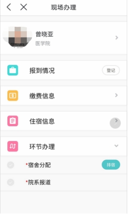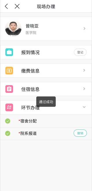 4)完成报到:如果学生已经完成‘缴费’、‘排宿’,则点开‘环节办理’可以看到‘院系报到’右边有个‘通过’按钮,点击通过即可,学生就已经完成报到,学籍才会变为正常在籍状态。