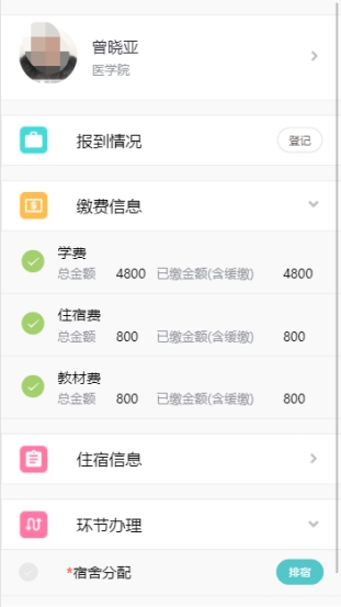 1)查看缴费情况:首先先看缴费信息,学生已经缴费过或者已经通过了绿色通道则缴费信息对应项目显示绿色对号;