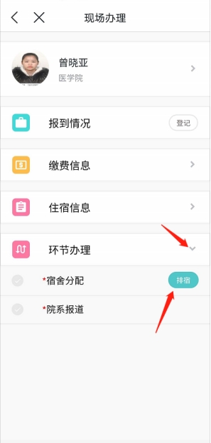3)分配宿舍:如学生没有提前分配好宿舍,需要点开‘环节办理’可以看到‘宿舍分配’右边有个‘排宿’按钮,点击进行分宿,选定宿舍楼、宿舍号、床位,点击确定