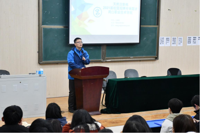 宣讲会上,阜阳天邦公司人事部王晓明经理就公司的发展历史、发展理念、员工待遇、校企合作班的学生优惠待遇等向学生做了详细介绍。