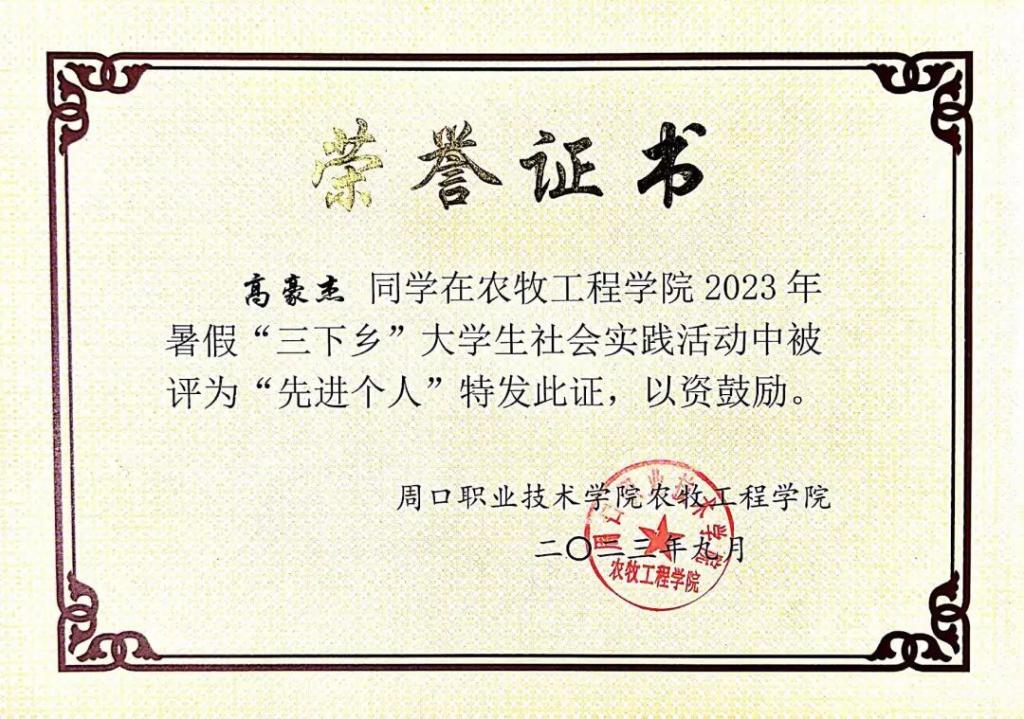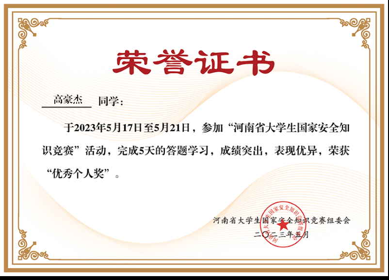 高豪杰在第七届“全国大学生预防艾滋病知识竞赛”答题活动中表现优秀,被授予“优秀志愿者”荣誉称号。2023年参加“河南省大学生国家安全知识竞赛”活动,完成答题学习,成绩突出,表现优异,荣获“优秀个人奖”。在2022年–2023学年度“消费者权益日知识竞赛”比赛中被评为一等奖。在2023年暑假“三下乡”大学生社会实践活动中获得“先进个人”的奖项。在2022–2023年度变现突出成绩显著而荣获三好学生称号。