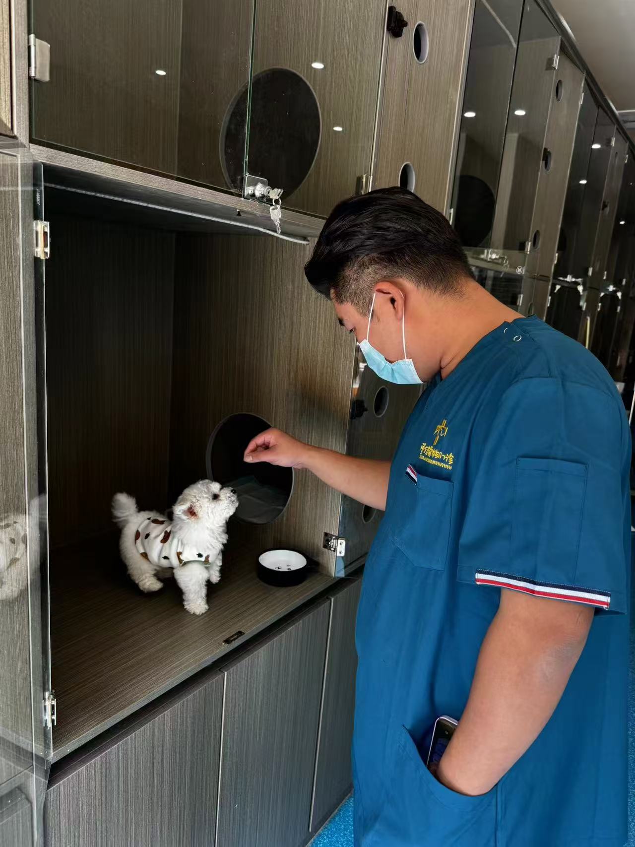 各种诊断仪器和治疗设备规范的摆设在室内,楼下留观区正在接待生病的宠物,楼上的美容室里洗浴区和美容区光洁明亮。诊疗室,董家乐一边和宠物主人沟通,一边认真的观察着宠物的情况,整个人表现出一种自信和严谨。