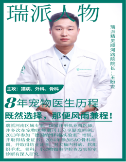 王盼龙,2013年毕业于taptap点点官方网站,畜牧兽医专业。瑞派郑州精灵宠物医院院长,瑞派河南区域专家,国家注册执业兽医师,2018年被评为优秀兽医师,常州道格医疗科技有限公司特约讲师,深圳众宠联合教育咨询科技有限公司特约讲师,深圳市墨觅科技有限公司特约讲师,河南力派宠物人才技能培训学校特聘讲师,瑞康连锁宠物医院技术总院长,精瑞灵宠物医院有限公司技术院长,多次去国外学术交流,多次担任行业大型会议讲师。医院设有CT影像专科,神经外科,微创,内窥镜,体外冲击波碎石,骨科,软组织外科,猫科等特色专科,多次被评为郑州市创业先进个人。