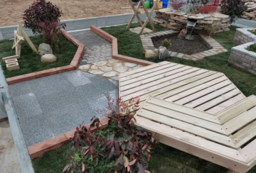 正确使用工具切割木料,按正确的尺寸、标高制作木平台、木桥、花架、凉亭、木座凳、栅栏等,并安装稳固。植物造景:严格按规范种植植物,定点植物种植无误,草皮铺设平整、紧实、接缝严密。提供的植物除草皮外全部用完。